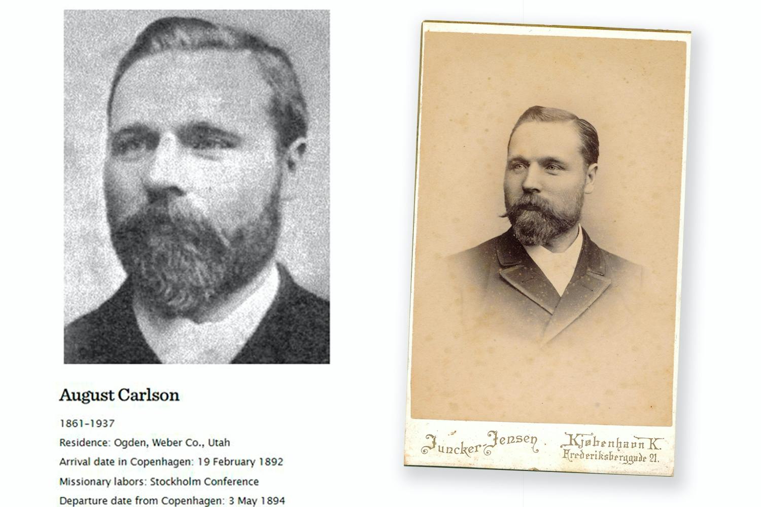 Glöm inte bort att använda nätet! Sök till exempel på olika namn, platser och yrken. Ibland har man tur och får träff. Med jämna mellanrum söker jag på olika sockennamn och går igenom bildträffarna hos Google. Plötsligt en dag fick jag en fullträff och hittade en bild från ett av mina egna album, föreställande en man jag dittils inte kunnat identifiera. Bilden återfanns på en hemsida över missionärer inom mormonkyrkan. Mannens namn var August Carlson och han var född på Stora Jonstorp i Öttums socken, Västergötland. Efter en sökning i släktdatabasen visade det sig att August var en avlägsen släkting. Hans farmor var en syster till en av mina anmödrar på farmors sida.