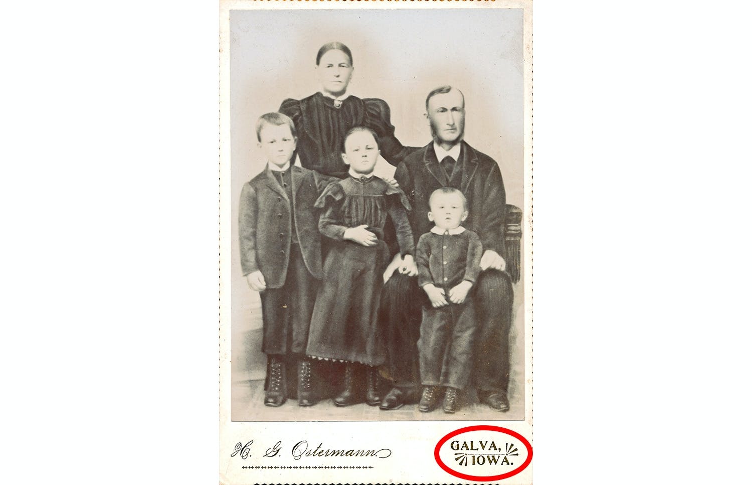 Men fotografens namn och plats kan ibland också vara vilseledande. Ett gammalt familjefoto i ett av mina album får utgöra ett exempel. På ramen står skrivet H G Ostermann, Galva, Iowa, varför man kan anta att kortet föreställer en emigrantfamilj i USA.