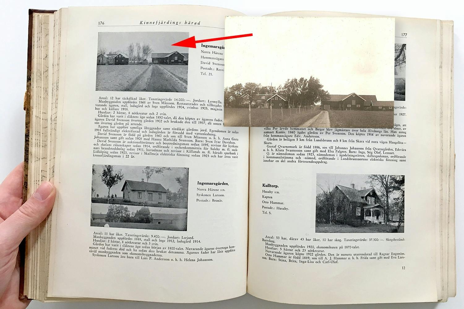 I ett försök att identifiera gården letade jag igenom alla de sammanställningar över gårdar i gamla Skaraborgs län som jag kunde komma åt. Efter mycket letande hittade jag till slut ett likadant fotografi med information om gården och ägarna. Den hette Ingemarsgården och låg i Norra Härene socken.
