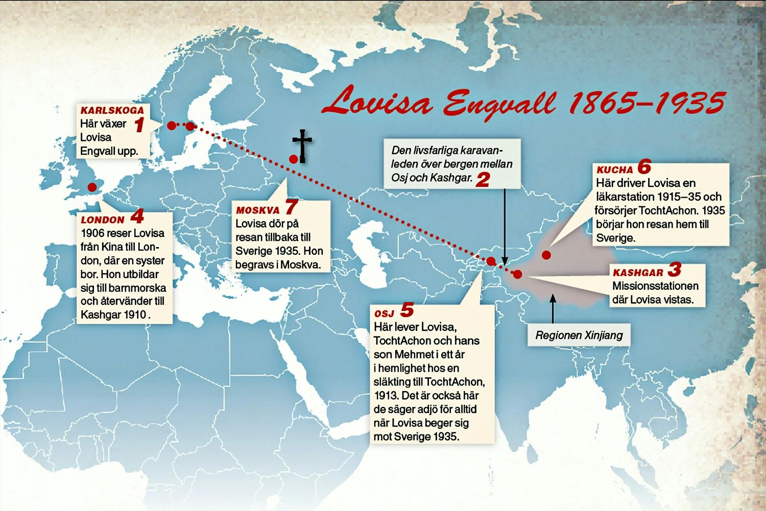 Historien börjar fjorton år tidigare, år 1900, när Lovisa reser från Värmland till ökenlandskapet Östturkestan i nuvarande nordvästra Kina för att missionera. Hon är 35 år gammal och har en två år lång utbildning bakom sig. Hon har läst engelska och geografi, kan spela gitarr och har gått en sjukvårdskurs.