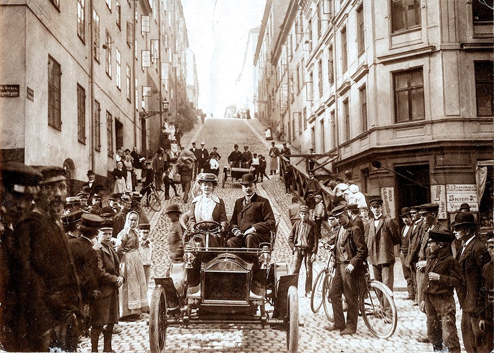 Redan på Göteborgsutställningen 1891 hade den första bensindrivna bilen visats upp i Sverige. Men det skulle dröja många år innan uppfinningen blev något annat än en teknisk kuriositet. Först med bilutställningarna i Stockholm 1903, 1904 och 1907 började i alla fall överklassen få upp ögonen. 1907 fanns 662 registrerade bilar i landet och samma år blev det krav på registreringsnummer och körkort. 1916 var antalet bilar uppe i 5 800.
