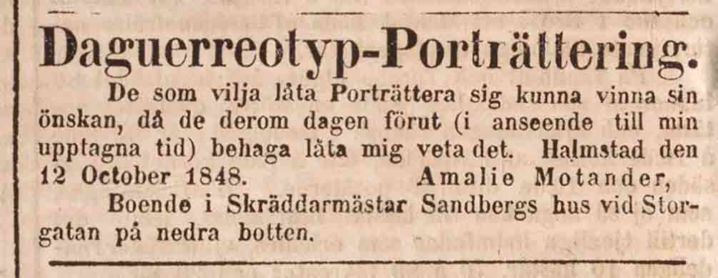 Den som troligen var den allra första kvinnliga fotografen i Sverige hette Amalie Motander. Hon föddes i Köinge i Halland och hennes föräldrar var lands- och stadsfiskalen Isak Ulrik Motander och Anna Maria Planck. Familjen kom till Halmstad i slutet av 1830-talet. Amalie Motander var verksam där som fotograf år 1848 – det vet vi eftersom hon det året satte in en annons i tidningen med texten: "Daguerrotyp-Porträttering. De som vilja låta Porträttera sig kunna vinna sin önskan, då de derom dagen före (i afseende till min upptagna tid) behaga låta mig veta det. Halmstad den 12 October 1848. Amalie Motander. Boende i Skräddarmäster Svedbergs hus vid Storgatan på nedra botten." Annonsen är den enda ledtråden till hennes fotografiska verksamhet och det finns inga daguerrotyper bevarade efter henne. Detta år satte även en manlig fotograf upp en tillfällig ateljé i Halmstad. Det var den kringresande "daguerrotypeuren" H Otto som från juli till september erbjöd porträttfoto, men även undervisning i tekniken och försäljning av utrustning, så det är mycket möjligt att det var hos honom Amalie Motander fick sin utbildning. Annonsen hon satte in är den enda av det slaget, så fotokarriären blev kanske inte så långvarig. Bara ett par år senare, 1850, bedrev hon handel med textilier och sybehör. Hon arbetade också som sömmerska med mera, och 1863 öppnade hon en flickskola i Halmstad.