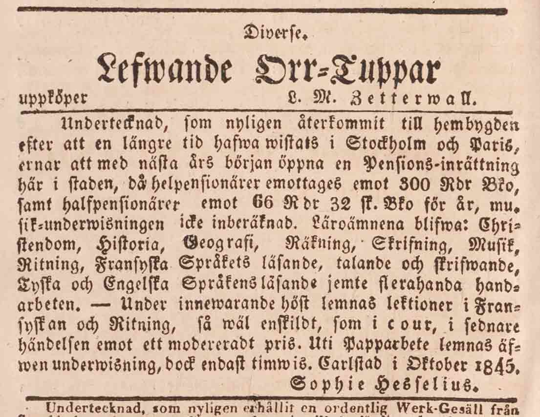 Den som brukar räknas som den andra av de svenska kvinnliga daguerrotypisterna var Brita Sofia Hesselius (kallad Sophie) i Karlstad. Det enda spåret efter hennes fotografkarriär är en annons hon satte in i Nya Wermlands Tidningen i september 1853, där hon tillkännager att hon hade tänkt att öppna en flickpension i Stockholm, men eftersom koleran härjade sköt hon upp detta till i juli året därpå. Tills vidare kunde hon då i Karlstad erbjuda "undervisning i Fransyska, ritning och målning" samt "äfwen porträtterar jag i Olja och Daguerrotype". Sophie Hesselius var född i Alster. Hennes pappas var brukspatronen på Allströms bruk, Olov Hesselius, och mamman hans hustru Anna Katarina Roman. Olov Hesselius dog redan 1815 när Sophie var 14 år. 1823 flyttade hon till Karlstad, där hon troligen jobbade som guvernant i några år. Under nära tjugo år flyttade hon sedan fram och tillbaka mellan Stockholm och Karlstad och var även en tid i Paris. År 1853 hade hon flyttat tillbaka till Karlstad mer permanent och då öppnade hon stadens första flickskola för döttrar från bildade hem. Hur mycket hon ägnade sig åt daguerrotypier vet man alltså inte och det finns inga bevarade arbeten efter henne.