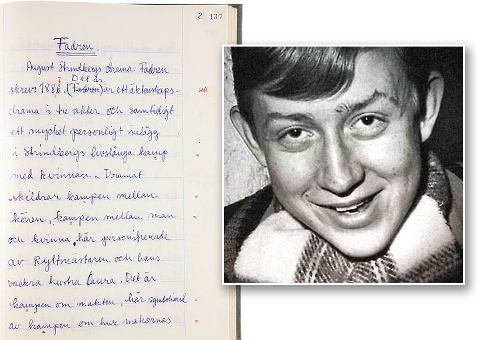 Leif valde att skriva en inledning till ett framförande i skolradio av August Strindbergs drama Fadren. Hans uppsats är på cirka nio sidor och fick litet a. Det var det näst högsta betyget och betydde ”Med utmärkt beröm godkänd”. Läraren som rättade uppsatsen, har markerat med rödpennan på 35 ställen i texten. Särskilt har denne reagerat på upprepningen av ordet kamp i uppsatsens inledning.