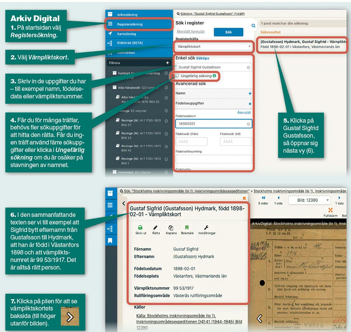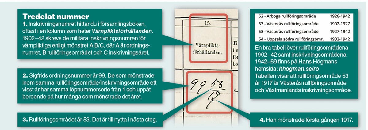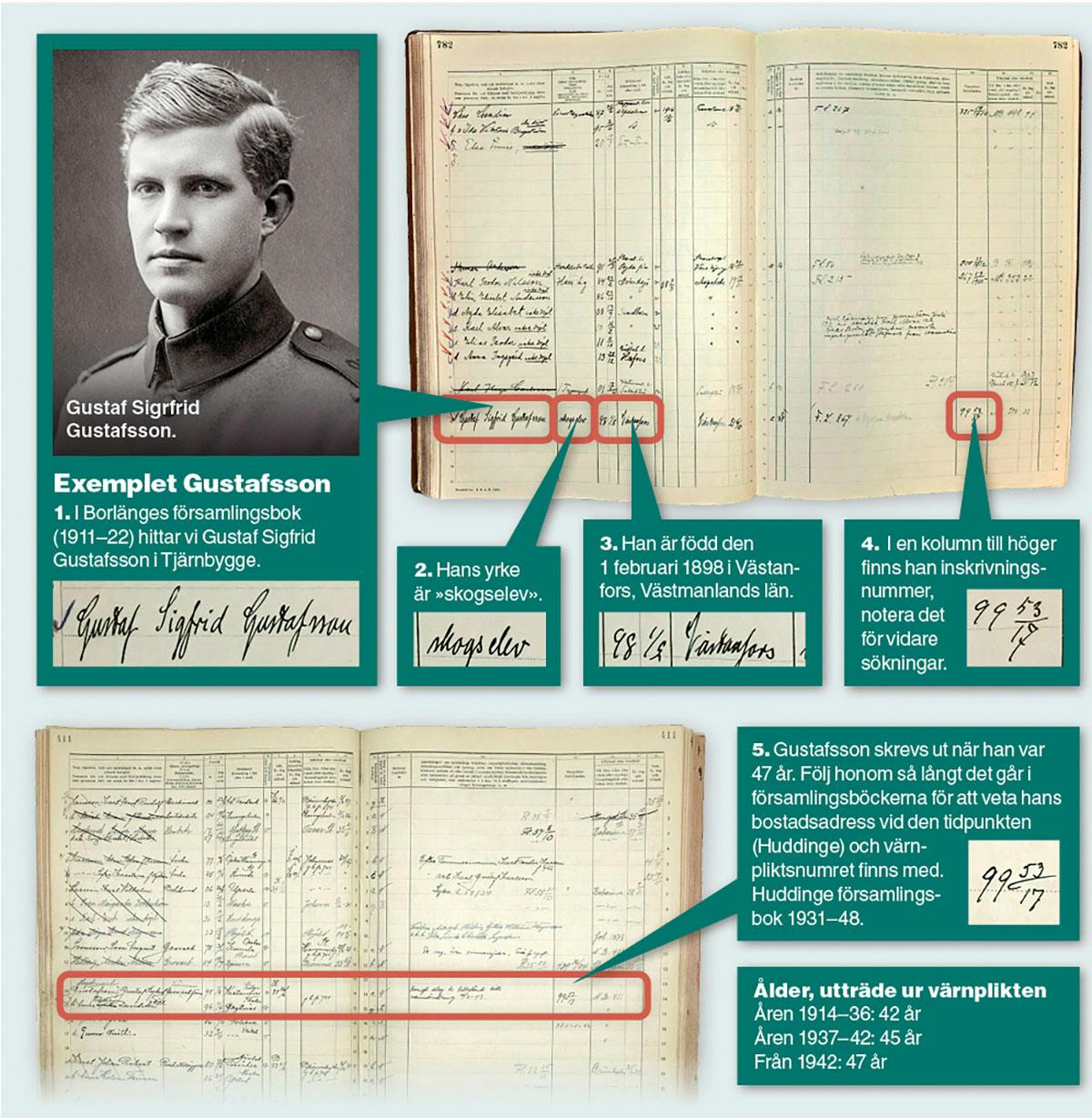 Mot slutet av 1890-talet upphörde husförhören och ersattes med frivilliga församlingsaftnar och läsmöten. Husförhörslängderna ersattes då succesivt av de så kallade församlingsböckerna. Så när vi letar efter information om våra släktingar på 1900-talet är det församlingsböckerna som är primärkällan. På grund av sekretessen på 70 år kan vi dock bara läsa dem digitalt till och med år 1948. Och eftersom en bok kan innehålla flera år slutar de digitaliserade ofta i slutet av 1930-talet eller i början av 1940-talet. Titta i spalten som heter Värnpliktsförhållanden, och leta upp värnpliktsnumret som består av tre tal. Det här numret följde med den värnpliktige fram tills han fyllde 40, 45 eller 47 år och inte skulle göra fler repetetionsövningar. Om du letar efter stamkort hos Riksarkivet behöver du veta var den värnpliktige bodde när han skrevs ut. Följ honom så långt det går i församlingsböckerna. Med namn, födelsedatum, värnpliktsnummer och bostadsort när han skrevs ut har du allt du behöver för att söka vidare. Om du har Arkiv Digital kan du ta genvägen och gå direkt till steg 4.