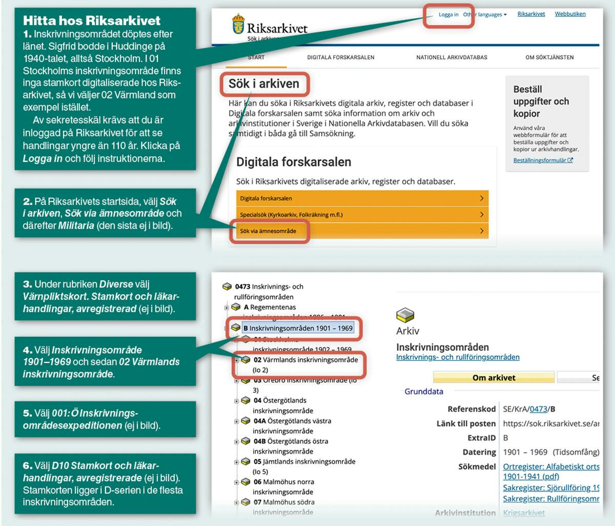 Krigsarkivet har runt två och en halv miljon stamkort över värnpliktiga som mönstrat mellan 1919 och 1969 – men endast en mindre del är digitaliserade. Man kan se dem på plats i Arninge eller beställa kopior. Arkiv Digital däremot har digitaliserat så gott som alla, och har dessutom ett sökbart register. Skillnaden är att Riksarkivet är gratis medan Arkiv Digital kräver abonnemang.
