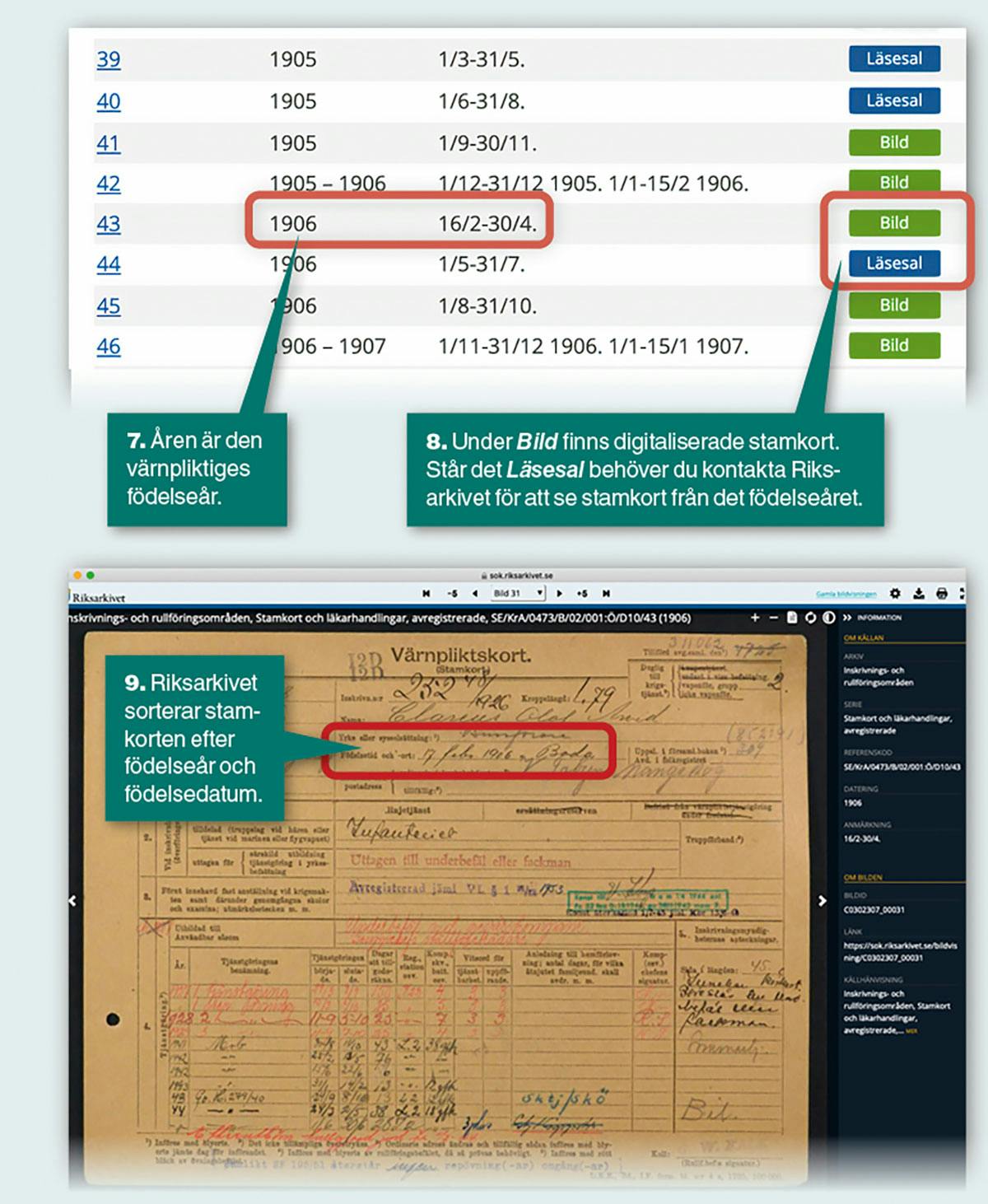 Arkiv Digital har digitaliserade stamkort för de unga män som mönstrade 1902–50, alltså för värnpliktiga som var födda mellan 1881 och 1930. Vissa tidigare och vissa senare år förekommer också. De har dessutom namnindexerat tusentals av dessa stamkort så att de är sökbara. Har du abonnemang hos Arkiv Digital kan du utnyttja deras enkla sökfunktion. Det räcker med namn och födelsedata på den värnpliktige för att hitta rätt.