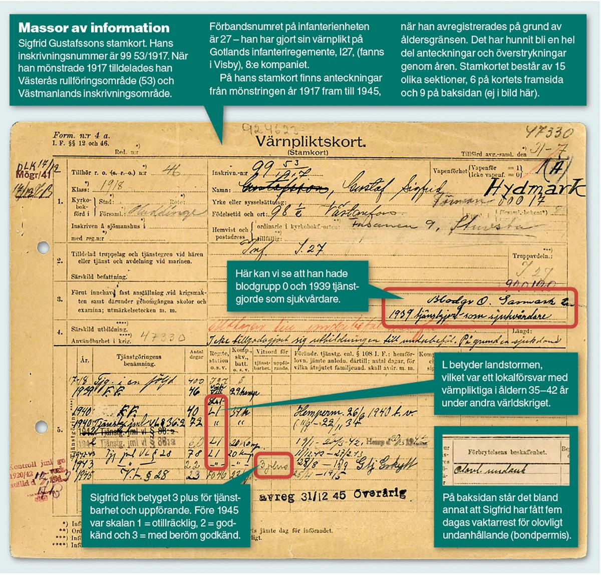 Stamkorten kan bland annat innehålla längd, blodgrupp, civilt yrke, tilldelat truppslag, beredskapstjänstgöring under andra världskriget, utbildningar, befordran,