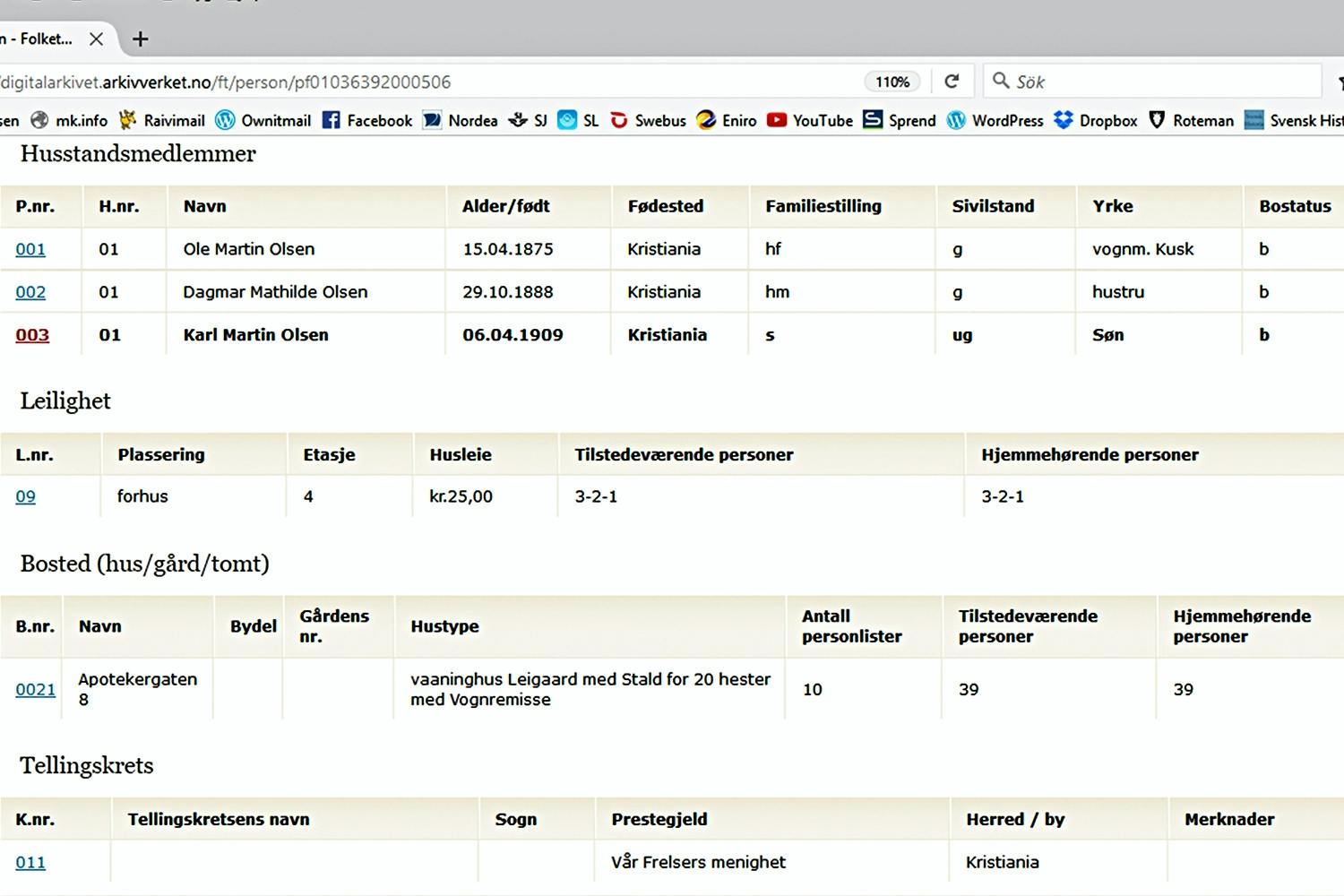 I exemplet nedan ser vi kusken Ole Martin Olsen med familj, bosatt i Kristiania (Oslo) på fjärde våningen i ett hus mot gatan på Apotekargatan 8. Hyran är 25 kronor per månad. Det bor 39 personer i huset och det finns på gården stall för tjugo hästar.