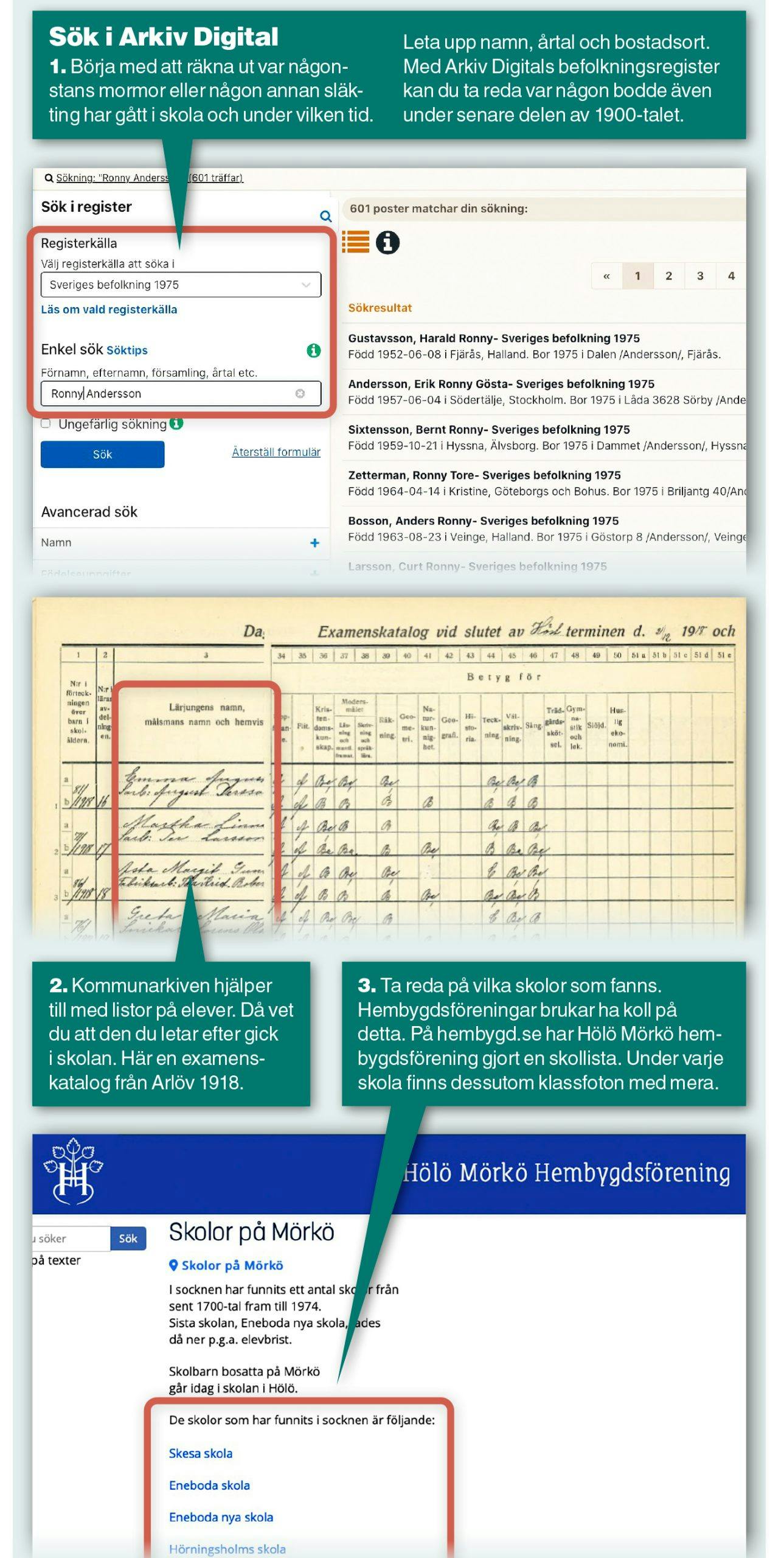 Innan du ger dig i kast med att leta upp klassfoton måste du förstås veta vem du letar efter. Med hjälp av husförhörslängder och församlingsböcker kan du se var släktingarna bodde när de gick i skolan. Med släktforskningsföretaget Arkiv Digitals nya befolkningsregister kan du ta reda på var någon bodde även under senare delen av 1900-talet, de räcker fram till 1990.