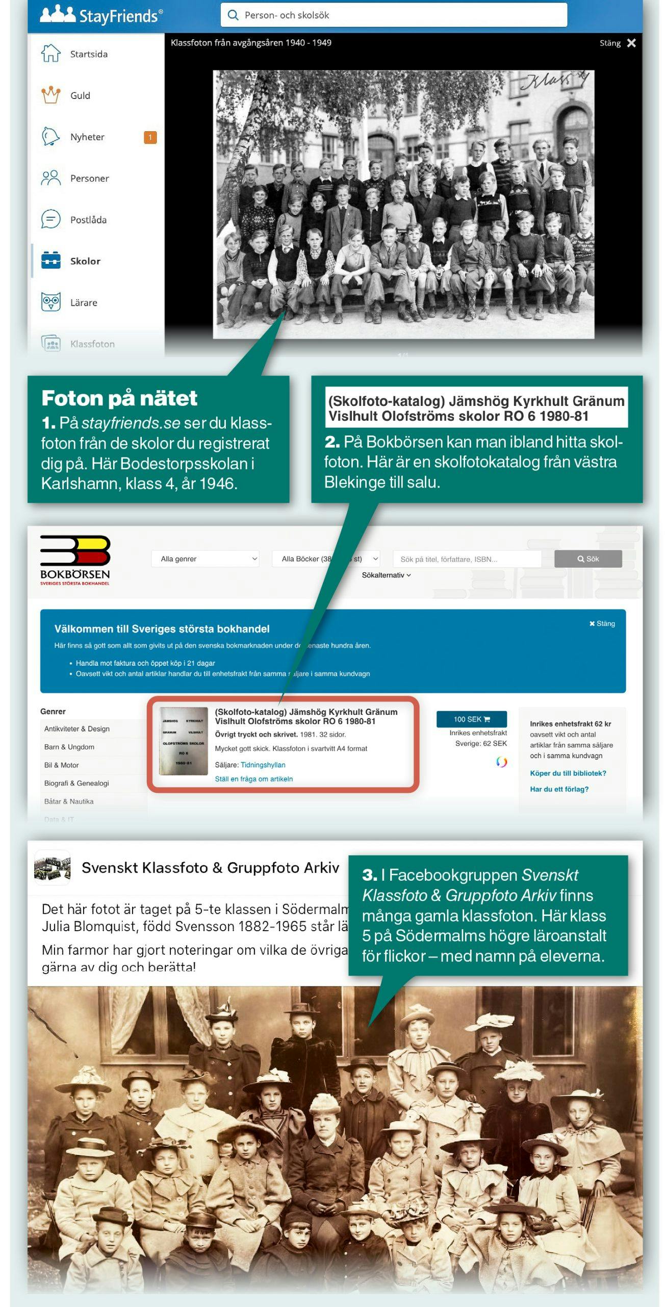 På stayfriends.se lägger medlemmarna upp klassfoton. Det är mest bilder från andra halvan av 1900-talet, men det finns även en del äldre. Man registrerar sig på de skolor man har gått på (eller är intresserad av) för att kunna se klassfoton. Som betalande medlem kan man se mer och själv lägga upp bilder. Vill du vända på alla stenar så gör även ett försök med My Heritage och Ancestry. Där finns miljontals släktträd som användarna har lagt in, några enstaka med klassfoton. För att hitta dem kan man till exempel söka på personer födda samma år och på samma plats som sin släkting. Facebook är en riktig guldgruva. Där finns massor av klassfoton, och du kan själv lägga in bilder för att få hjälp att identifiera eleverna. Svenskt Klassfoto & Gruppfoto Arkiv och Porträtt från förr är två exempel på rikstäckande grupper. Många böcker och häften med skolfoton finns också på Bokbörsen med 20 000 anslutna antikvariat och privatpersoner som säljare.
