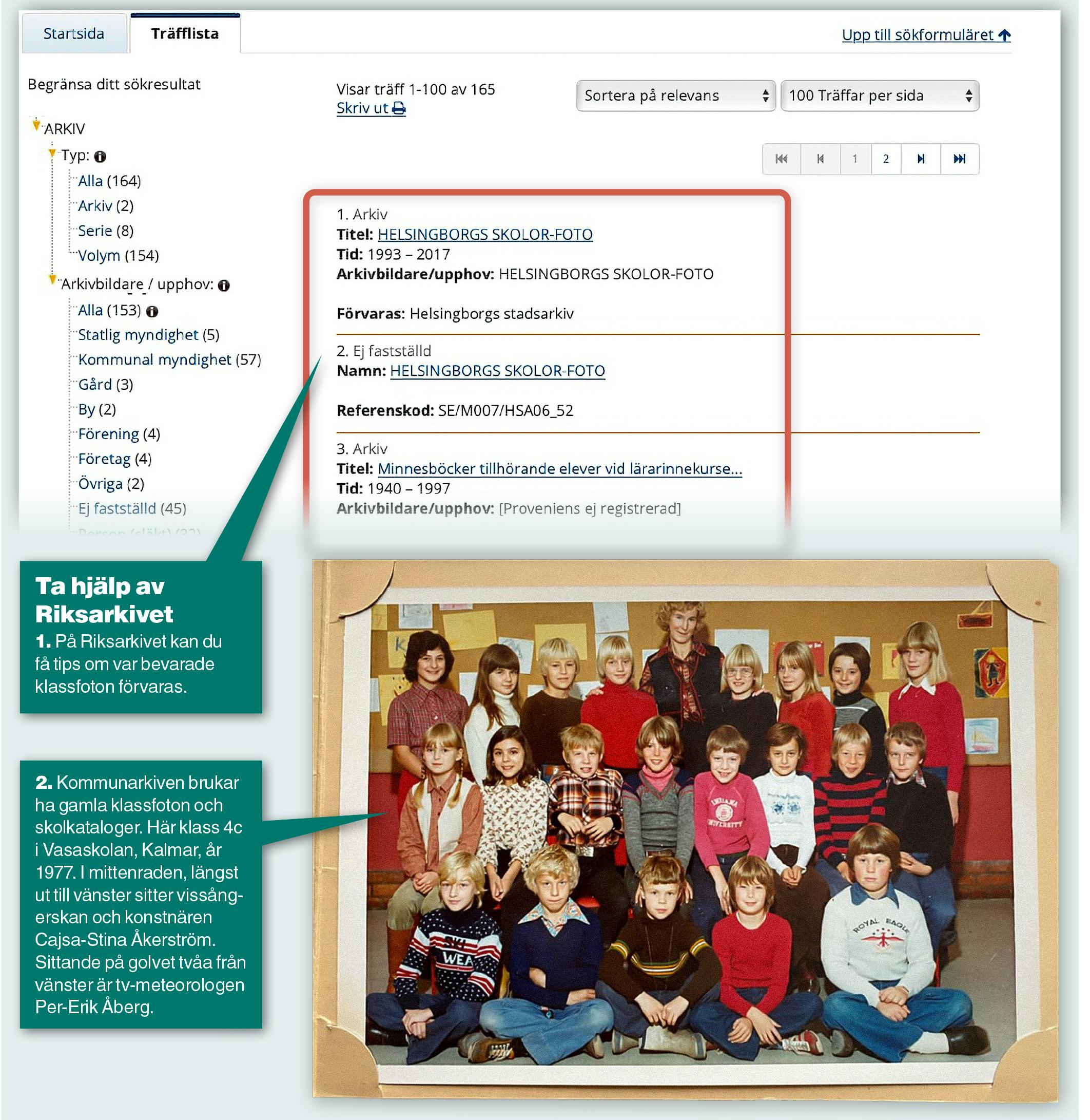 Använd din fantasi och leta efter klassfoton på alla ställen du kommer på. Har du frågat släktingar om de har kvar klassfoton eller andra foton? Sök också på skolornas namn och platser på Google. Det kan finnas lokala arkiv med klassfoton – och även privata släktsidor. Många hembygdsfantaster har lagt ner ett stort arbete på att sammanställa gamla skolbilder. Ett lysande exempel är en portal som heter