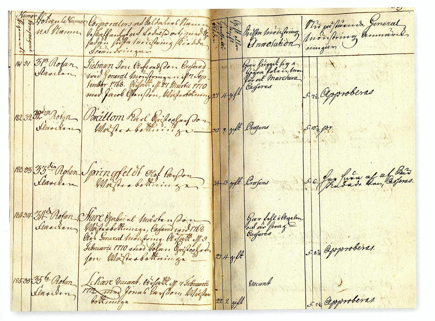 I de militära rullorna var man mindre noga, då det i första hand handlade om huruvida soldaten var tjänstduglig eller inte. Däremot kan man som i regel lita på de uppgifter om tjänstgöringstid som anges, eftersom det var något som militären hade all anledning att hålla reda på.Rullan uppger också hur lång soldaten var, men den uppgiften får tas med en liten nypa salt, eftersom längduppgifterna för en och samma karl kan varierade upp och ned mellan olika mönstringar. Slutligen anges också huruvida soldaten är gift eller inte (hustruns namn uppges aldrig, bara att en sådan finns). För ryttarna vid kavalleriet anges även grundläggande uppgifter om hästen: ålder, färg, storlek och eventuellt skick. I en särskild anmärkningskolumn noteras uppgifter om sjukdom eller annan frånvaro vid mönstringen, om bevistade fälttåg eller eventuella skador.